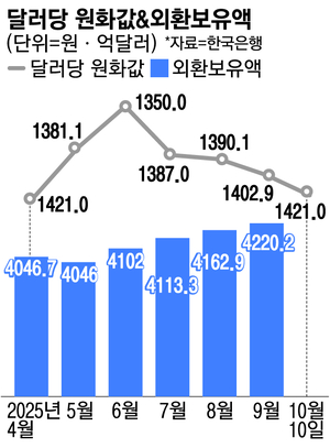 이런 가운데 이날 한국은행은 지난달 말 기준 우리나라 외환보유액이 4220억2000만달러(약 600조원)라고 밝혔다. 지난 8월보다 57억3000만달러 늘어난 것이다. 우리나라 외환보유액은 지난 5월 말 4046억달러로 약 5년 만에 최소 수준으로 줄었는데,이후 4개월간 연속 증가세를 보이고 있다. 한은 관계자는 “운용 수익이 늘고 분기 말 효과로 금융기관의 외화예수금도 증가한 데 따른 것”이라고 설명했다. 한국의 외환보유액 규모는 8월 말 기준 4163억달러로 세계 10위 수준이다. 중국이 3조3222억달러로 가장 많았고,일본(1조3242억달러),스위스(1조222억달러),인도(6954억달러),러시아(6895억달러),대만(5974억달러),독일(4682억달러),사우디아라비아(4564억달러),홍콩(4216억달러) 등이 뒤를 이었다.
