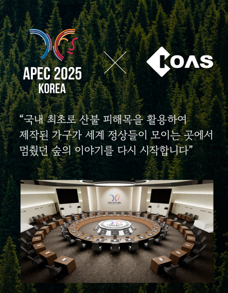 민경중 코아스 대표는 “숲의 상처를 의미 없이 지워버리지 않고,국가의 자원으로 다시 태어나게 하는 것이 큰 의미가 있다”며 “이번 APEC 정상회의는 재해를 혁신으로 바꾸는 대한민국의 상징이 될 것”이라고 말했다. 그는 또 “국산 피해목 활용은 국가 온실가스 감축 노력(NDC)과 산림자원 자급 기반 확대,산업·지역 상생의 ESG 모델 실현을 가능하게 한다”며 “당사는 APEC 정상회의 종료 후 모든 협찬가구를 기부해 사회적 가치를 더할 계획”이라고 덧붙였다.