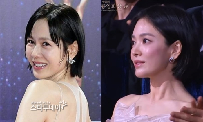 ‘46회 청룡영화상’에 참석한 배우 손예진(왼),송혜교. 사진|스타투데이DB,‘46회 청룡영화상’ 중계화면 배우 손예진이 ‘칼단발’로 파격 변신하며 공식석상에 등장해 화제를 모았다.