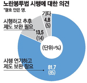 28일 매일경제 설문조사 결과에 따르면 경제학자들 대부분은 노란봉투법 시행에 대해 크게 우려하고 있는 것으로 나타났다. 응답자 104명 중 85명(81.7%)은 '시행을 연기하고 제도 보완부터 해야 한다'면서 '선보완 후시행'에 동의했다. 반면 '내년 3월 10일부터 시행하고 추후 제도를 보완하자'고 응답한 경제학자는 14명(13.5%)밖에 되지 않았다.