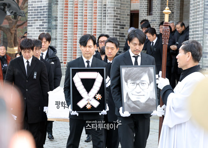 고(故) 안성기 추모 미사·영결식이 9일 서울 명동성당에서 엄수됐다. 고(故) 안성기 추모 미사·영결식이 9일 오전 서울 명동성당에서 엄수됐다.영정과 금관문화훈장은 정우성,이정재가 들고 설경구,유지태,조우진,박해일,주지훈,박철민이 고인을 운구했다. 2026.1.9#‘국민배우’ 안성기,오늘 영면