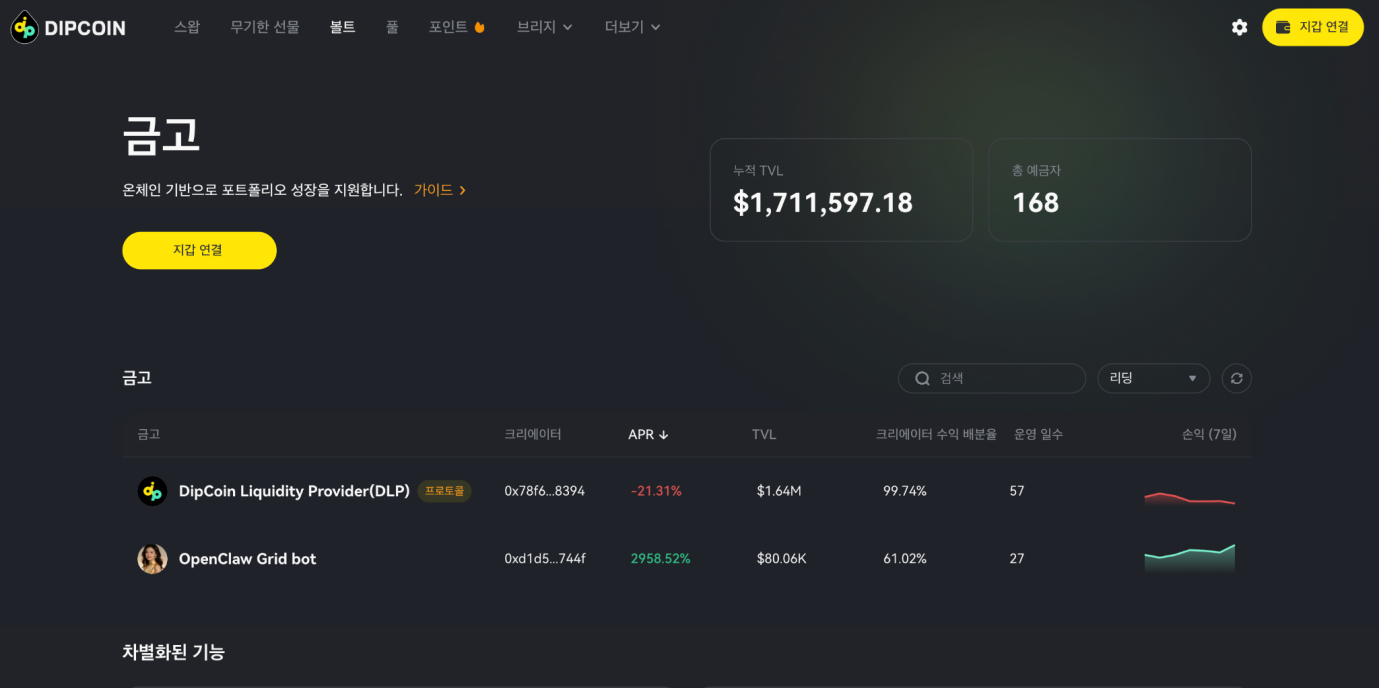 또한 DipCoin은 멀티 Vault 구조를 채택했다. 동일한 지갑 주소로 여러 개의 Vault를 생성할 수 있으며, 각 Vault는 자금과 포지션이 완전히 분리된다. 이를 통해 트레이더는 추세 전략, 차익거래 전략, 시장 중립 전략, 퀀트 전략 등 다양한 전략을 동시에 운영할 수 있다. 시장 사이클 변화에 따라 전략 포트폴리오를 유연하게 조정할 수 있다는 점에서 DipCoin은 점차 온체인 전략 마켓플레이스로 발전하고 있다.
