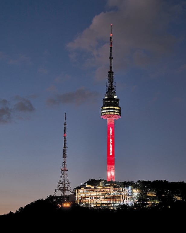 BTS 새 앨범 제목인 ‘ARIIRANG’이 새겨진 남산타워의 모습. <빅히트뮤직>