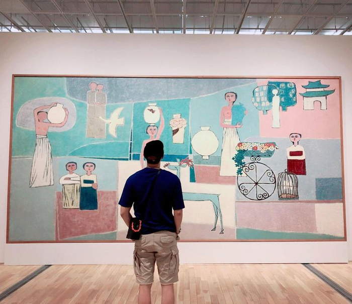 2021년 RM이 국립현대미술관에서 전시된 김환기의 ‘여인들과 항아리’ 앞에 선 모습. <BTS 공식 X 캡처> 방탄소년단과 관련된 명소들도 주목받고 있다. 자타공인 예술 애호가인 RM이 다녀간 미술관들이 대표적이다. 단순 관람을 넘어 기부와 도슨트 참여,소장품 대여로 이어지는 그의 행보는 한국 미술 시장의 지형도를 바꾸고 있다.